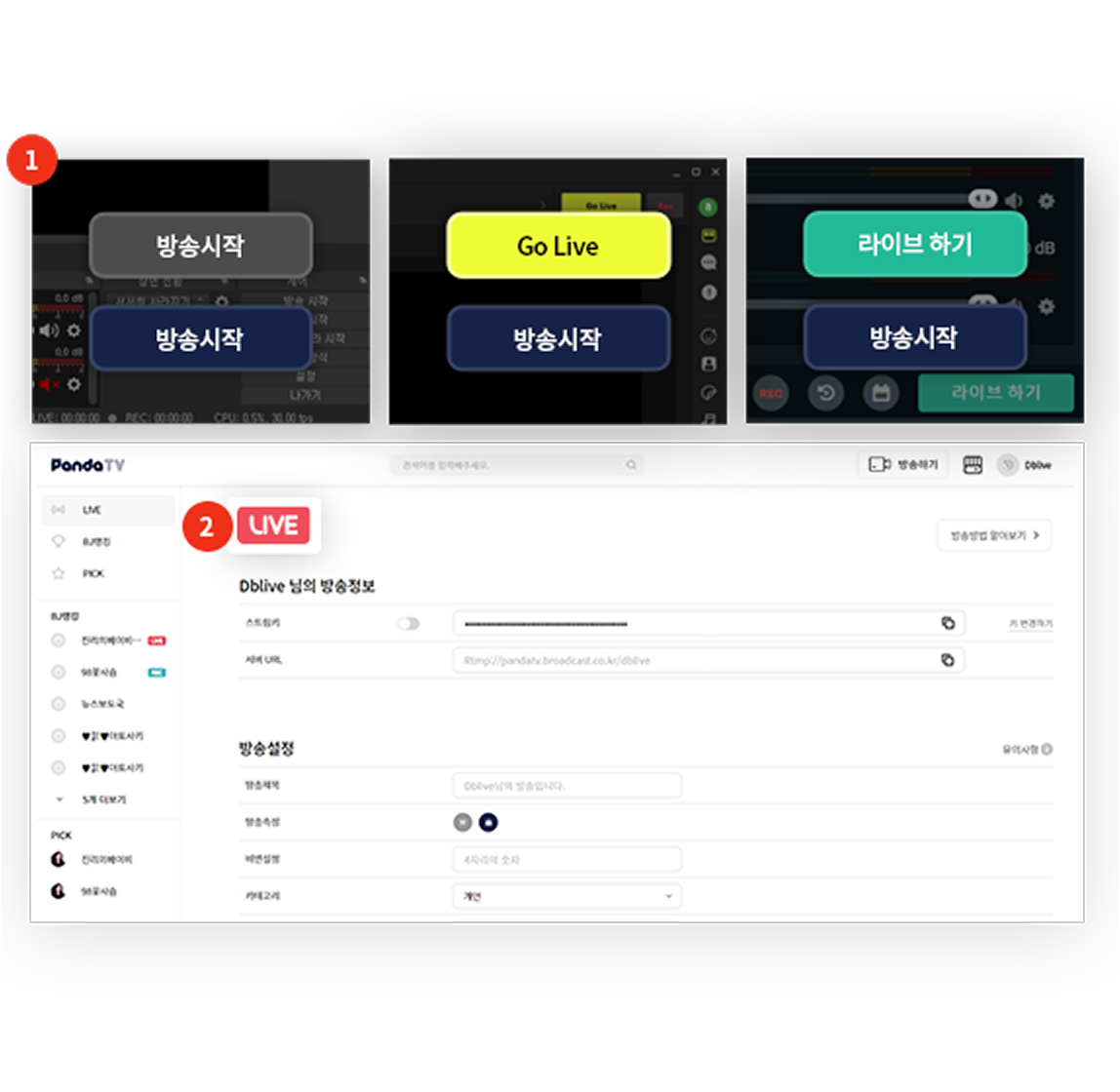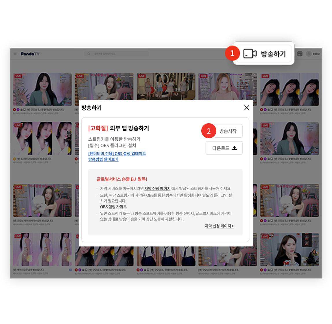 - 1홈페이지 상단 오른쪽 방송하기 버튼 클릭