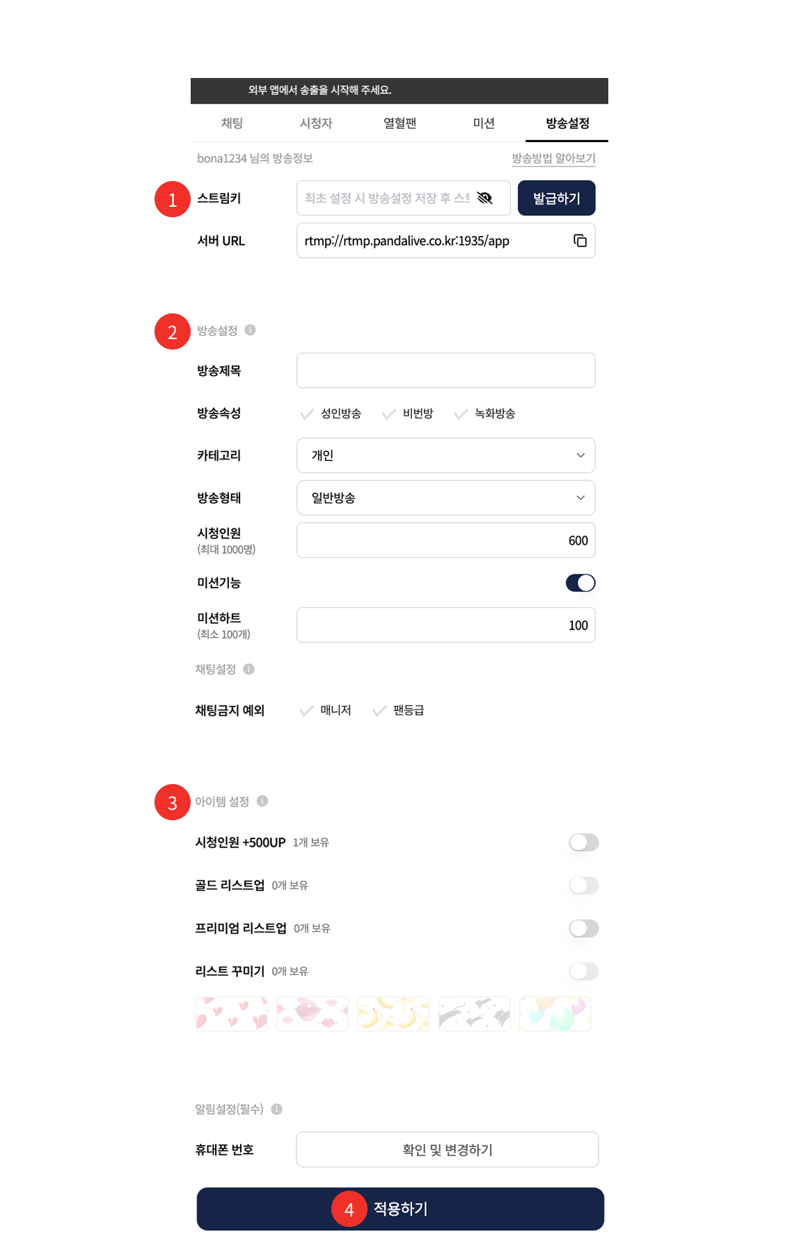 - 2방송설정 및 아이템 설정하기 - 방송제목 입력 - 방송속성: 19금 방송, 비밀번호 ON/OFF - 비밀번호 설정 (비밀번호 ON시 표기) - 방송 카테고리 선택 - 방송 형태 선택 (일반방송, 유료방송, 팬방송) - 시청인원 설정 - 아이템 설정 (해당하는 아이템을 보유하고 있을 시 설정 가능)