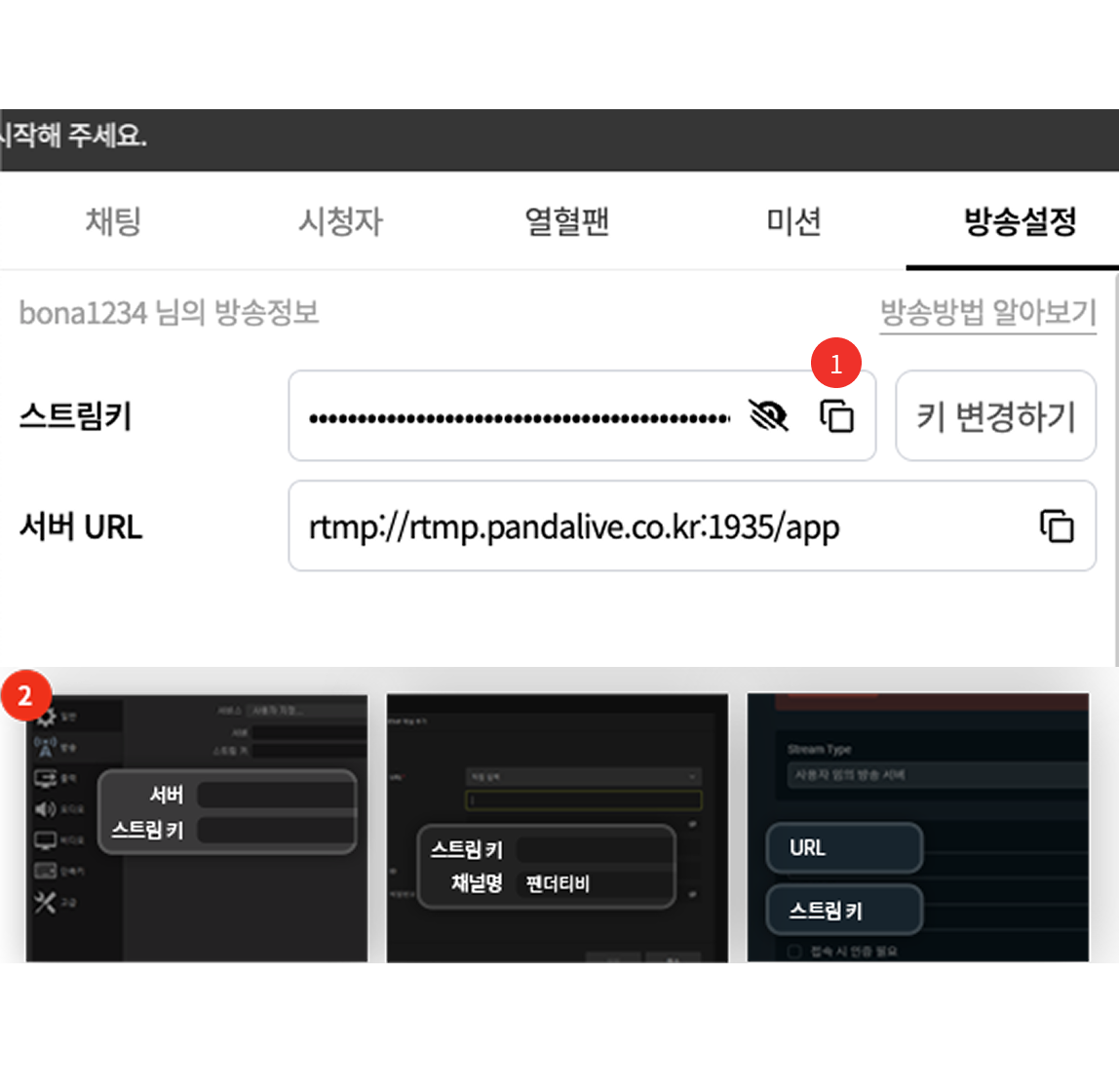 - 1발급 받은 스트림키, 서버 URL 확인 후 복사 아이콘 클릭하여 복사하기